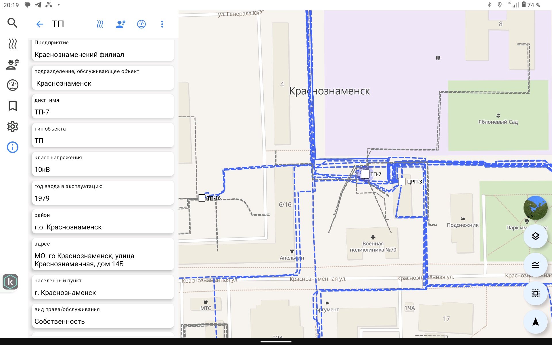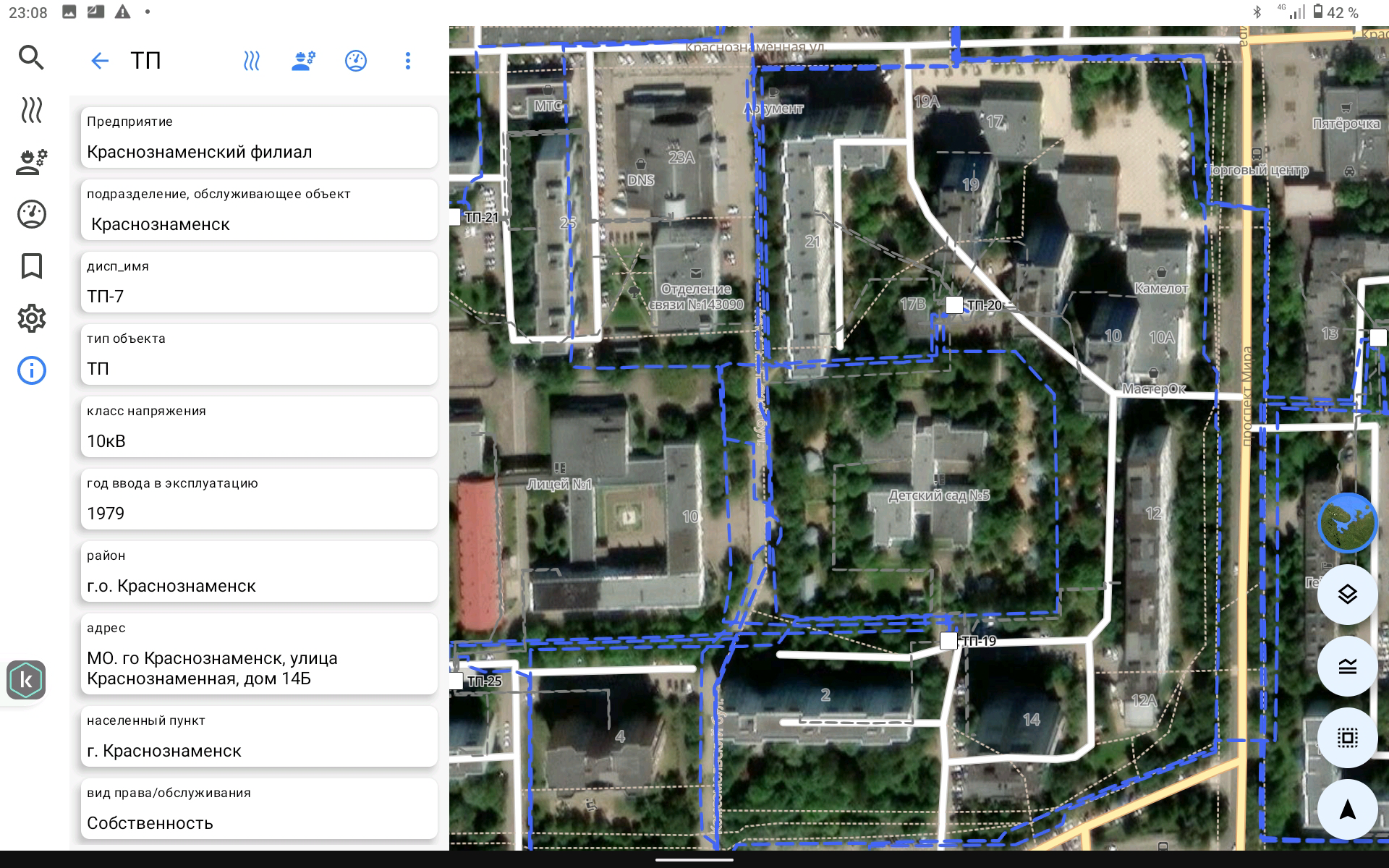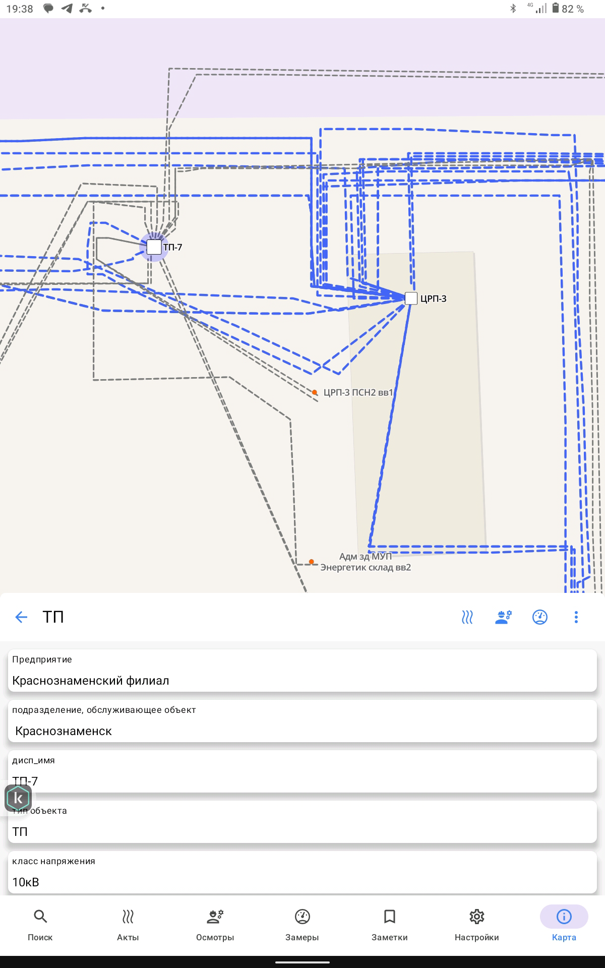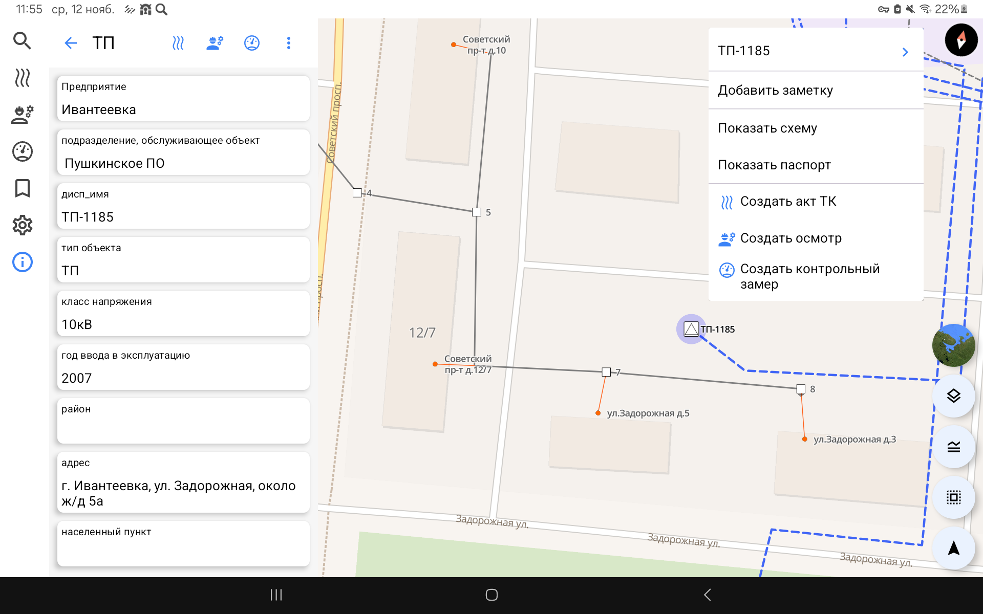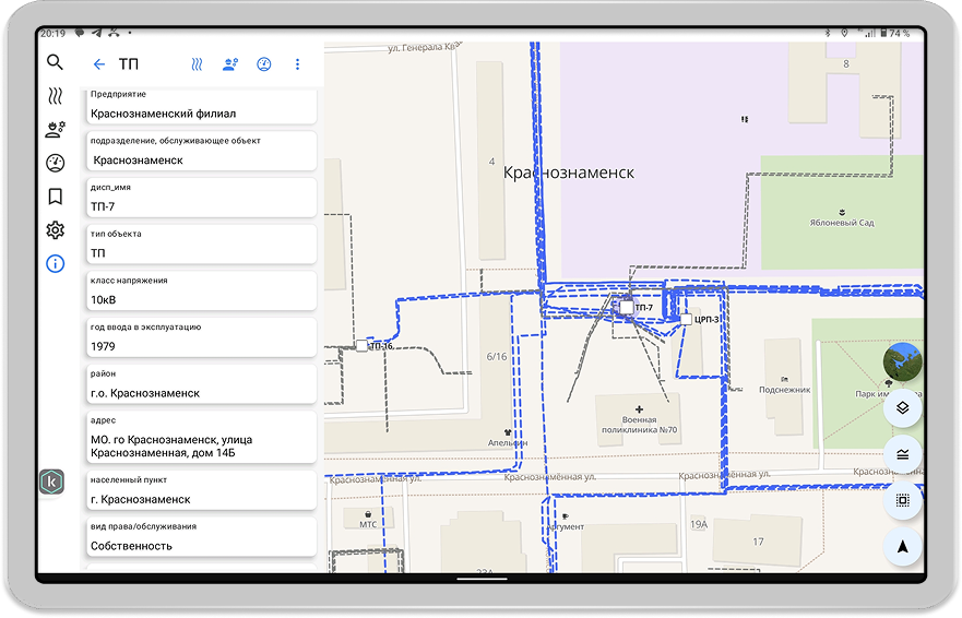 • Пользователь выбирает объект в мобильном приложении (электроустановку или линию электропередач на карте), после чего наименование и адрес объекта фиксируется автоматически;