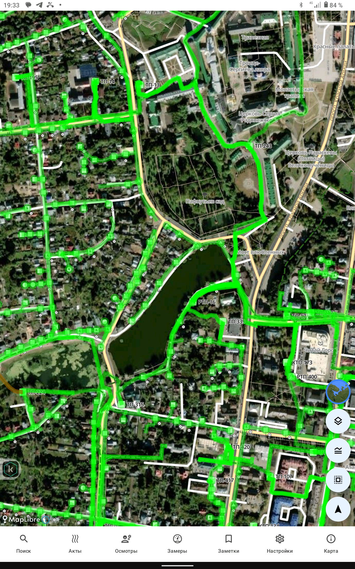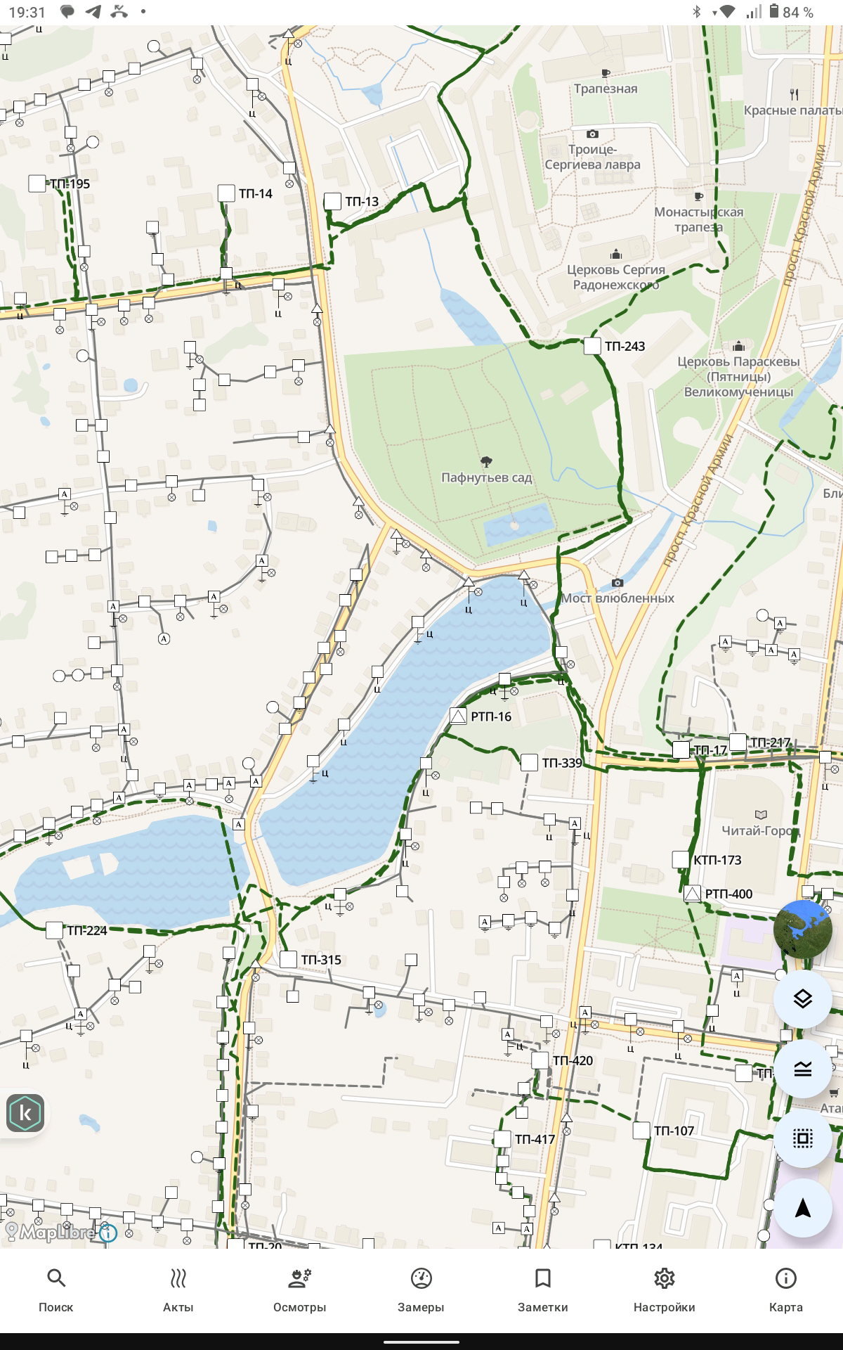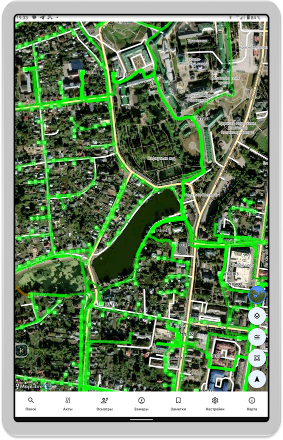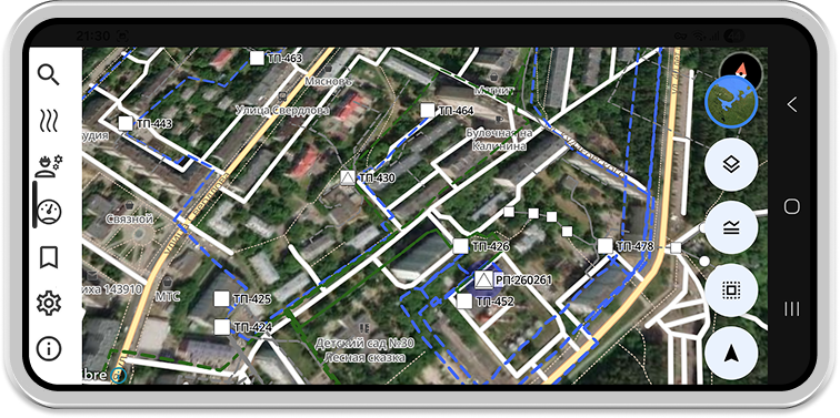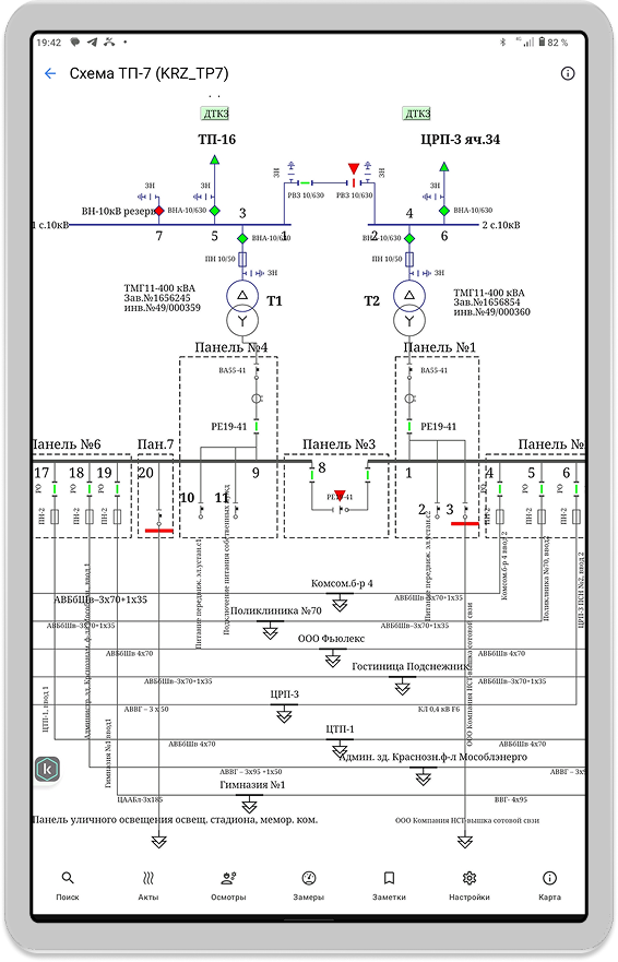 Карта мобильного устройства формируется на сервере мобильного приложения и загружается локально для офф-лайн режима работы. Карта представляет собой базу с набором тайлов и объектами поопорных схем из системы паспортизации оборудования.