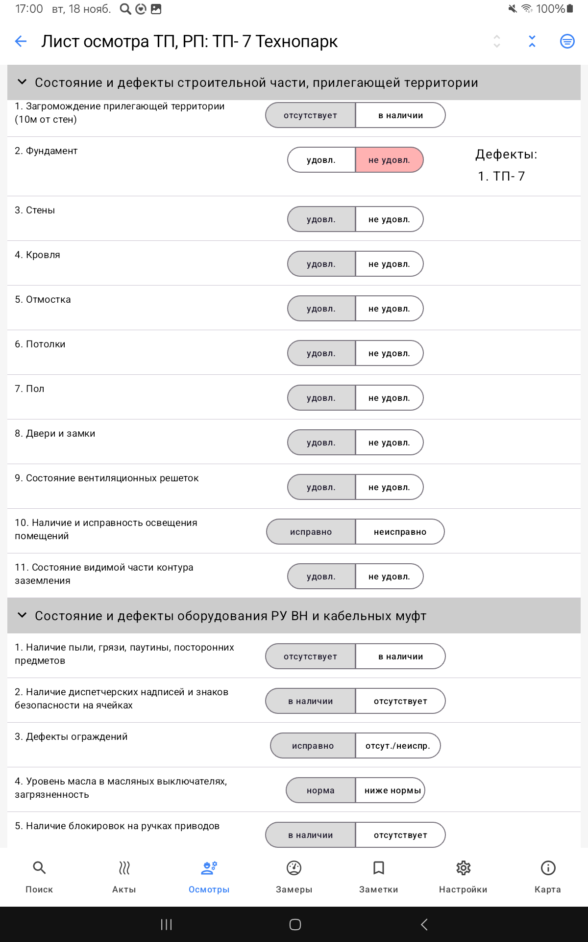 Интерфейс заполнения форм листов осмотра, актов ТК и листа замеров на мобильном АРМ: