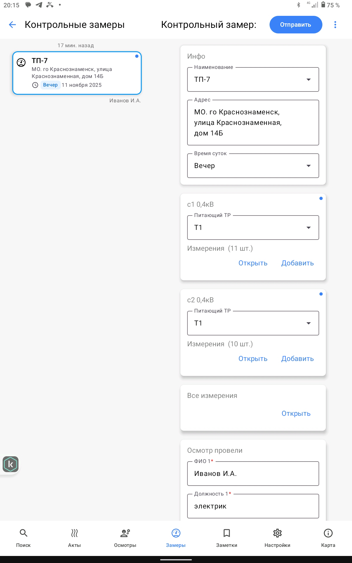 • Пользователь должен указать ФИО и должность лиц, производящих осмотр. Без заполнения обязательных полей акт ТК, осмотр или контрольный замер не отправятся на сервер паспортизации.